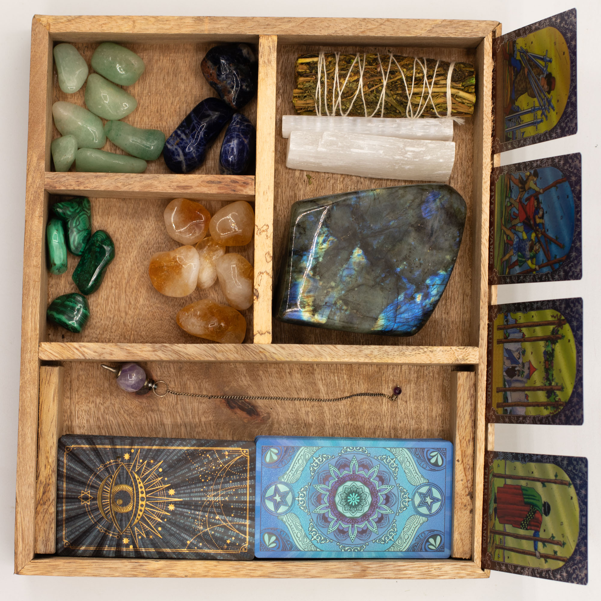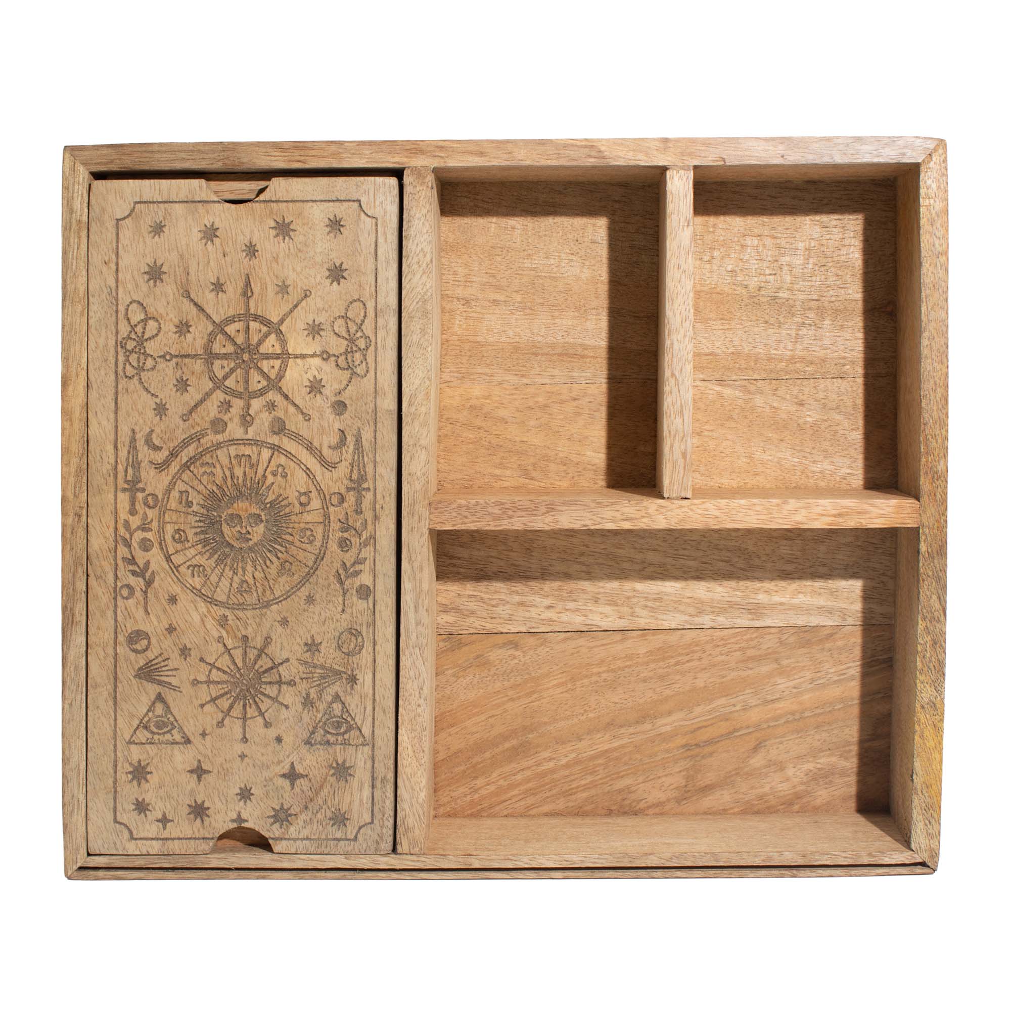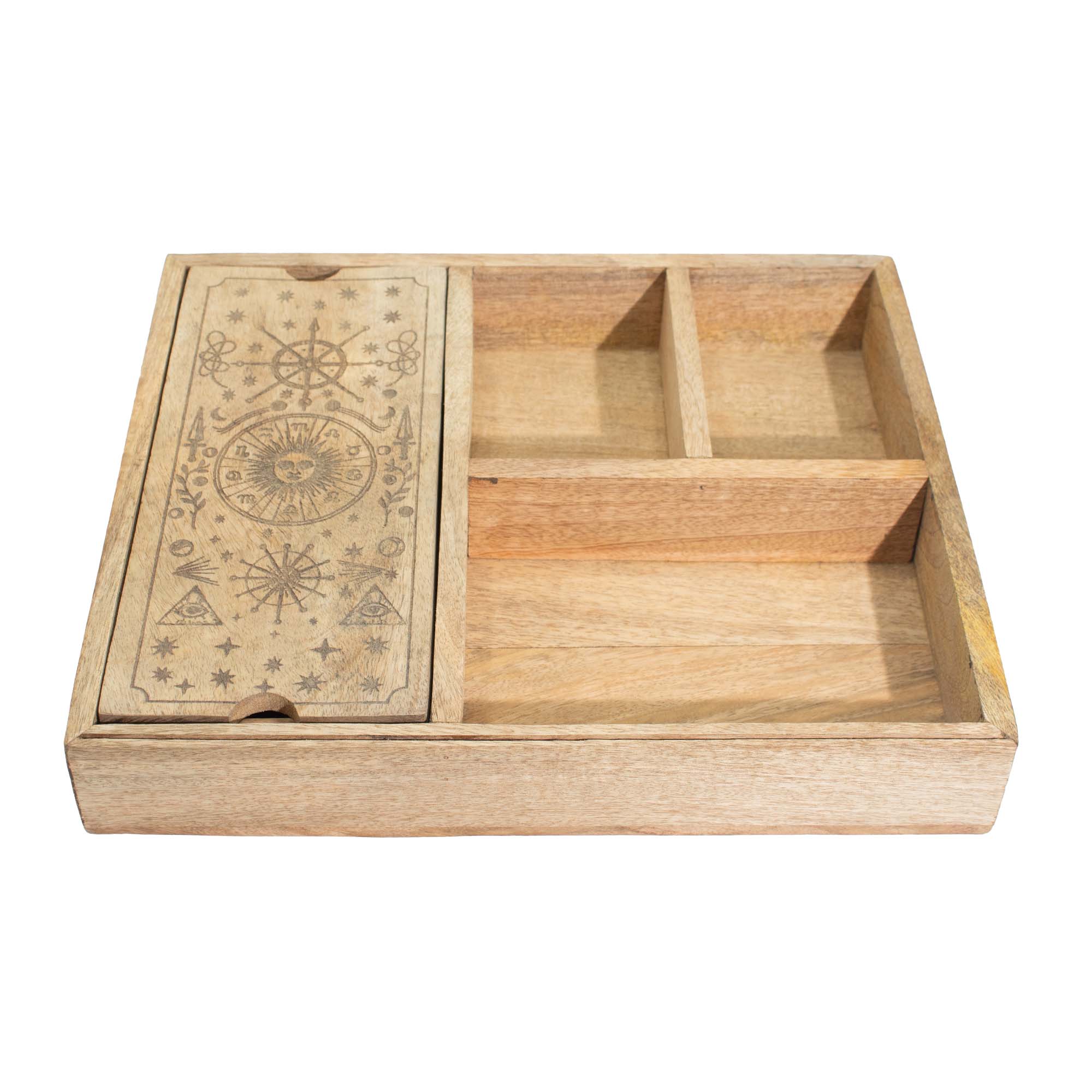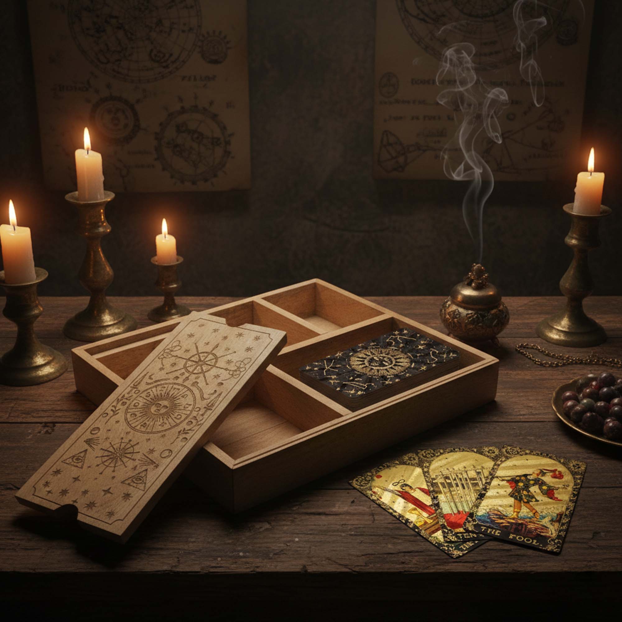 Czteroczęściowe pudełko na karty tarota wykonane z naturalnego drewna, zaprojektowane z myślą o przejrzystej organizacji talii oraz akcesoriów do pracy z kartami. Funkcjonalny układ wnętrza pozwala na uporządkowane przechowywanie wszystkich niezbędnych elementów w jednym miejscu, łącząc praktyczność z estetyką.