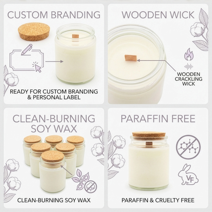 Zestaw obejmuje 6 sztuk świec wykonanych z ekologicznego wosku sojowego o masie 160 g każda. Świece umieszczone są w transparentnych szklanych słojach z naturalnym korkowym zamknięciem, co podkreśla ich wysoką jakość i rzemieślniczy charakter. Drewniany knot podczas spalania delikatnie skwierczy, co w połączeniu ze świeżym aromatem lnu tworzy wielowymiarowe doświadczenie relaksu przez ok. 26 godzin. Podobnie jak pozostałe produkty z tej linii, świece są pozbawione etykiet, dając sprzedawcom detalicznym pełną swobodę w projektowaniu własnych kolekcji zapachowych pod unikalną marką.