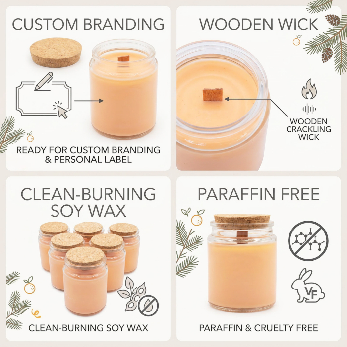 Zestaw 6 sztuk tych świec to idealna propozycja dla partnerów, którzy chcą wzbogacić swoją ofertę o produkty kojarzone z naturą i aktywnym stylem życia. Każda świeca wykonana jest z naturalnego wosku sojowego o masie 160 g, a drewniany knot podczas palenia tworzy relaksującą atmosferę dzięki delikatnemu trzaskaniu, imitującemu ogień w kominku. Szklany słoik z naturalnym korkiem podkreśla ekologiczne podejście do produktu i stanowi doskonałą bazę pod markę własną. Dzięki brakowi etykiet, każdy sprzedawca może swobodnie zaprojektować wygląd zewnętrzny, idealnie dopasowując produkt do swojej strategii marketingowej.