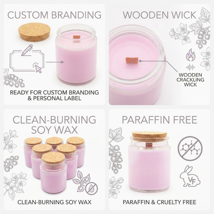 Zestaw 6 sztuk tych świec to doskonała propozycja dla partnerów hurtowych, którzy poszukują zapachów nastrojowych i niszowych, idealnych do budowania ekskluzywnych kolekcji marek własnych. Każda świeca o masie 160 g wykonana jest z naturalnego wosku sojowego i posiada drewniany knot, który podczas palenia wydaje kojący dźwięk trzaskającego ognia, co w połączeniu z aromatem Wilczego Księżyca potęguje wrażenie przytulności i luksusu. Minimalistyczny szklany słoik z naturalnym korkiem stanowi elegancką bazę, która dzięki brakowi etykiet pozwala na dowolną personalizację i nadanie produktowi unikalnej tożsamości wizualnej.