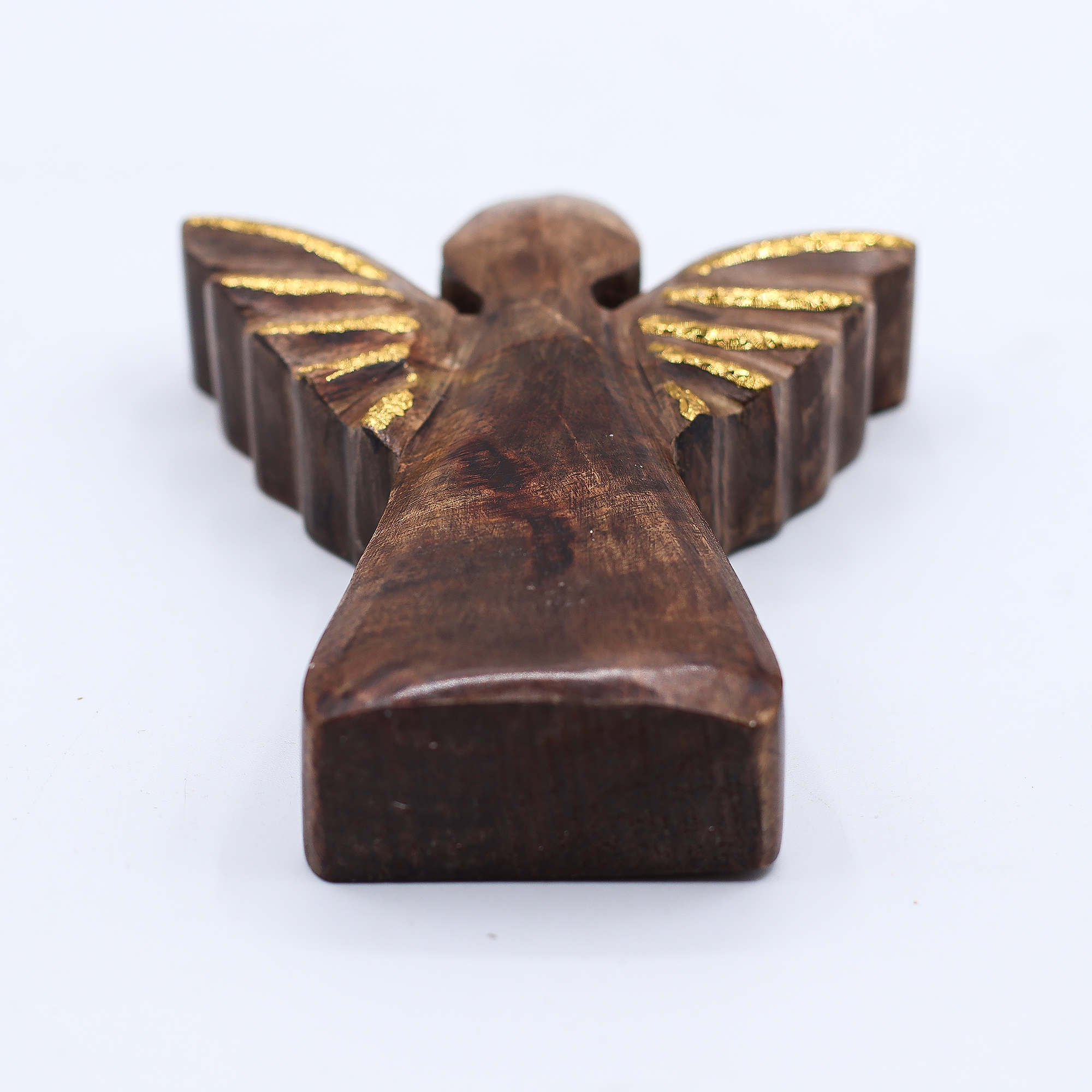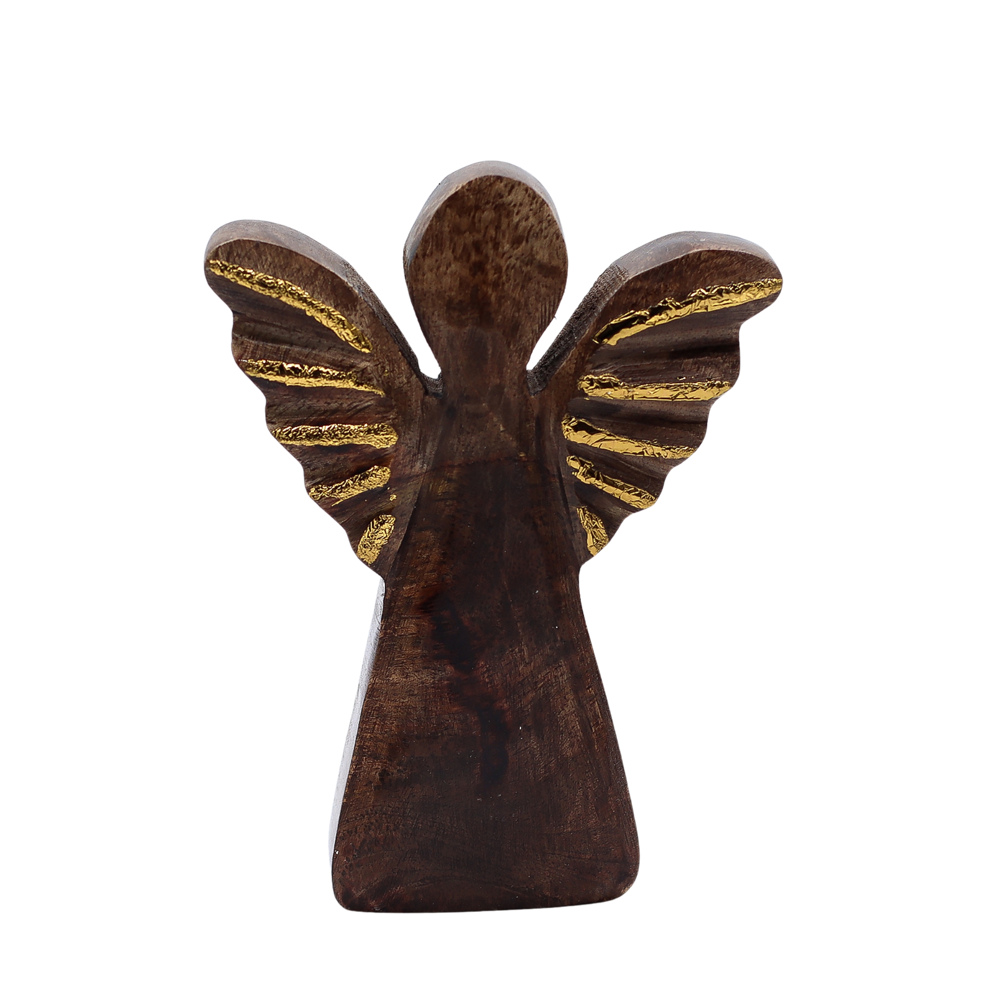 Ten uroczy anioł o wysokości 12 cm został ręcznie wyrzeźbiony w Indiach z drewna mango pochodzącego ze zrównoważonych źródeł. Jego prosta, klasyczna forma nabiera wyjątkowego charakteru dzięki pięknym, złotym skrzydłom, które subtelnie połyskują i przyciągają wzrok.