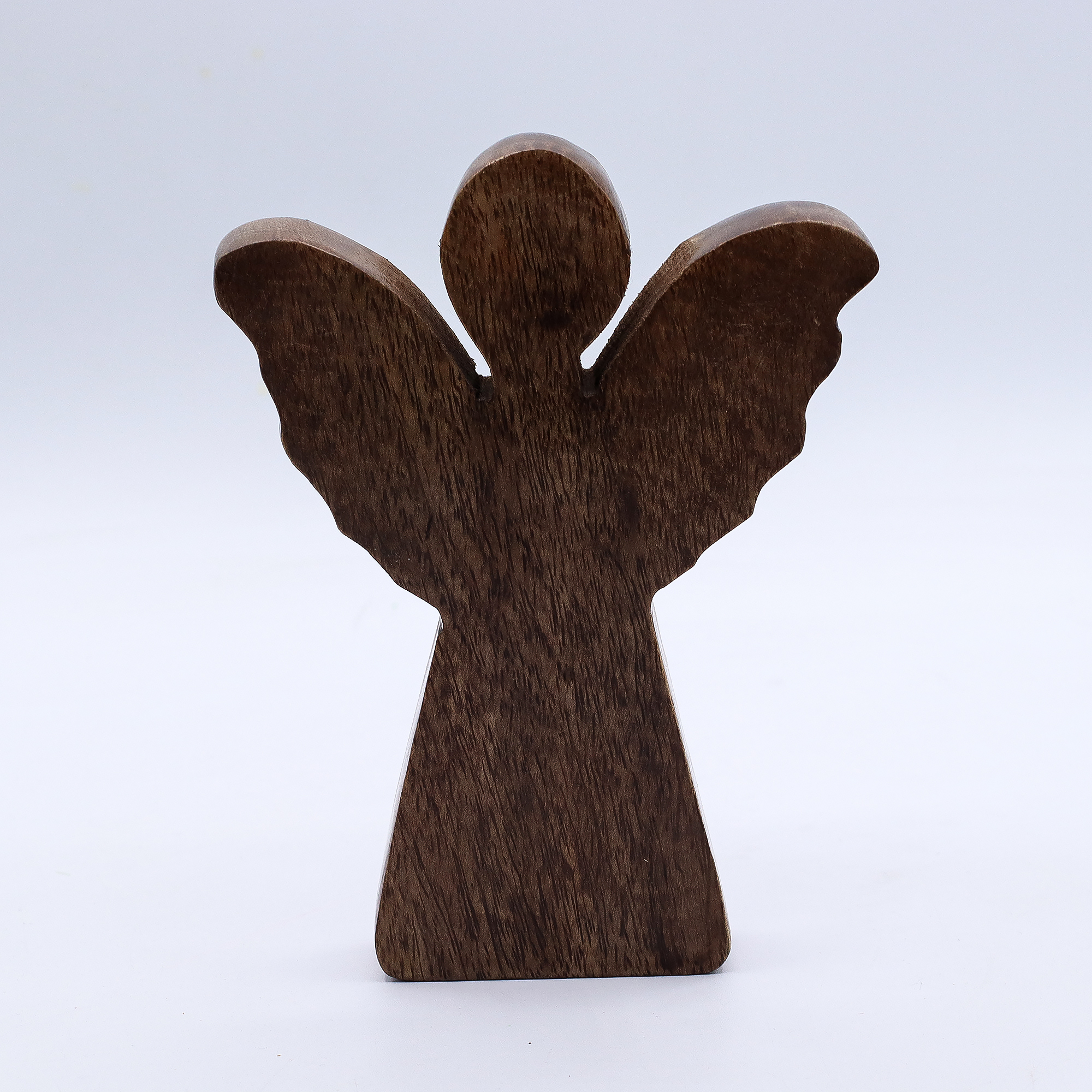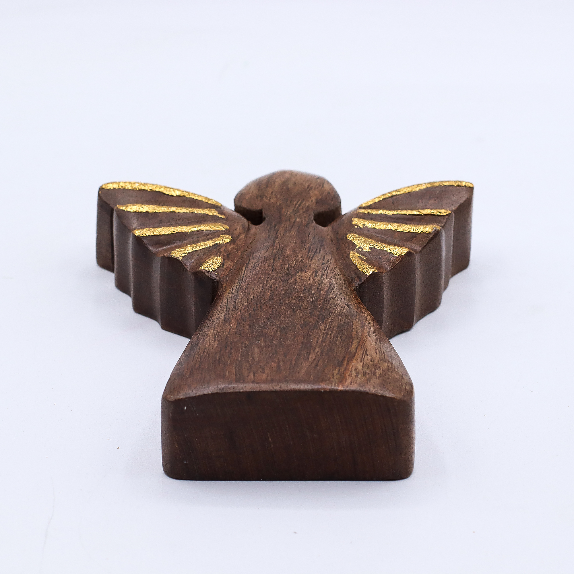 Anioł został wykonany w Indiach z drewna mango pochodzącego ze zrównoważonych źródeł, co czyni go produktem nie tylko pięknym, ale i odpowiedzialnym. Złote skrzydła dodają mu szlachetności i podkreślają jego symboliczne znaczenie – ochrony, spokoju i duchowej obecności.