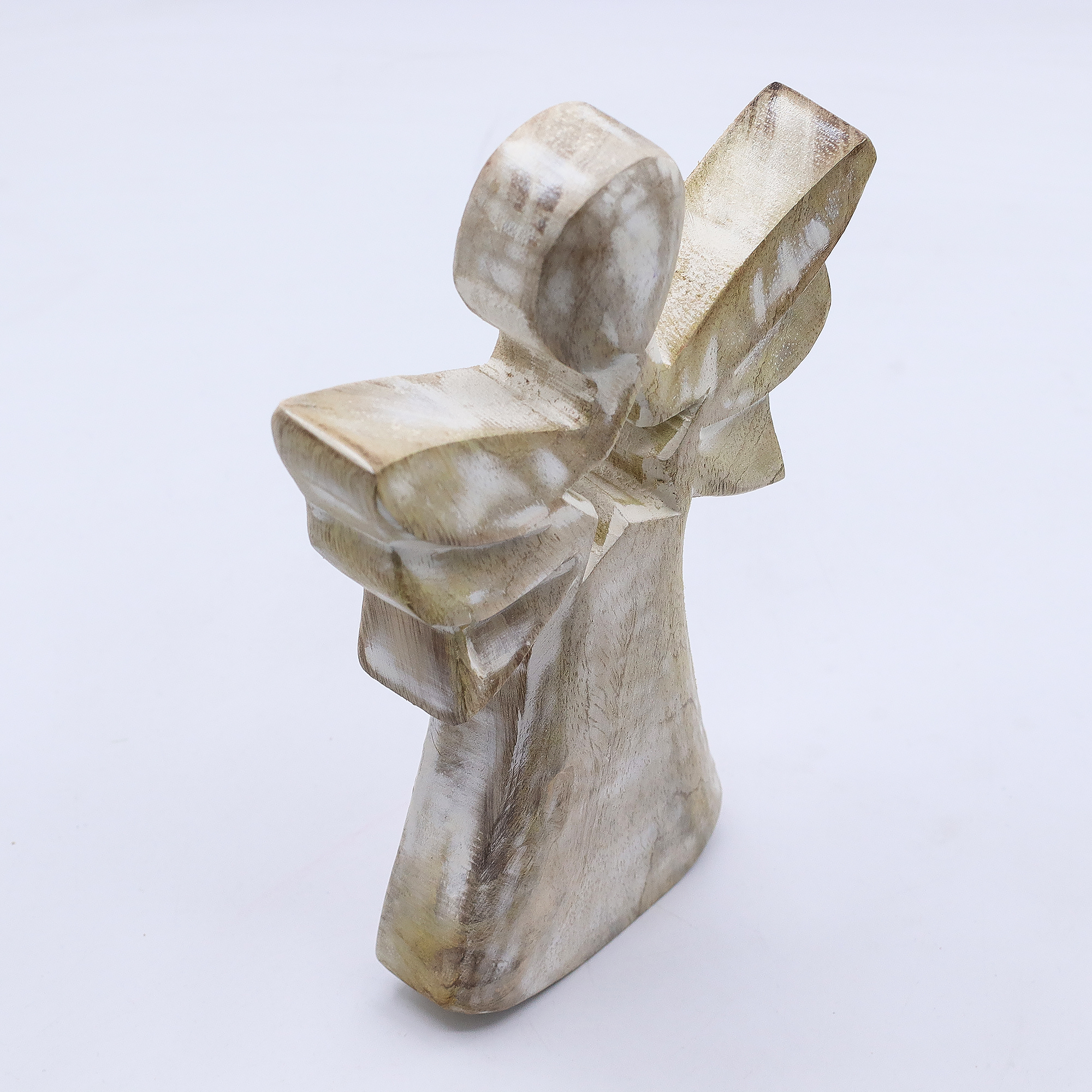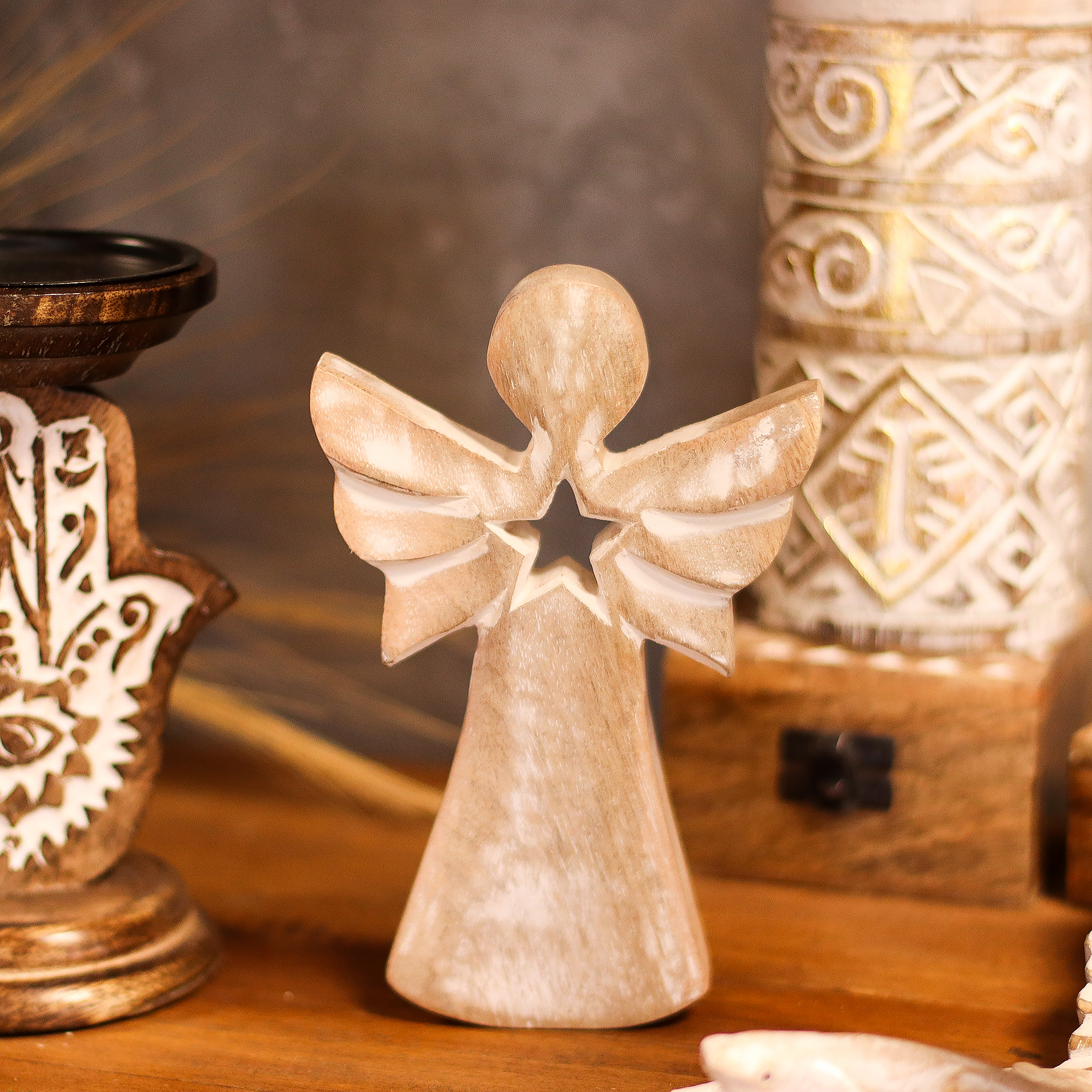 Ręcznie rzeźbiony anioł z drewna mango o wysokości 18 cm to dekoracja, która łączy prostotę formy z subtelnym detalem – wyciętą w drewnie gwiazdą. Bielenie typu whitewash podkreśla naturalną fakturę drewna i nadaje całości delikatnego, rustykalnego charakteru.