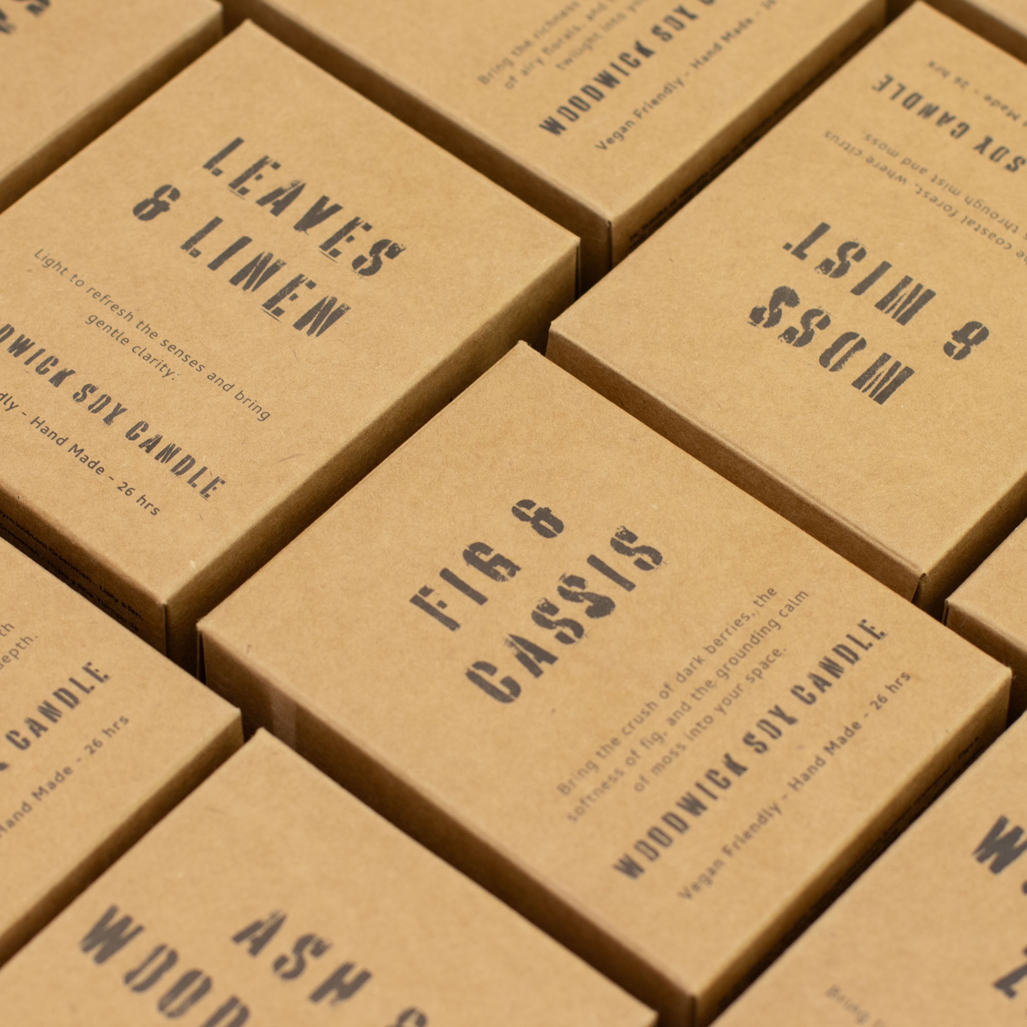 Każda świeca jest elegancko zapakowana w zielony szklany słoik z korkową pokrywką i dodatkowo w kartonik z brązowego papieru – idealny do ekspozycji w butikach, sklepach prezentowych czy przestrzeniach wellness.